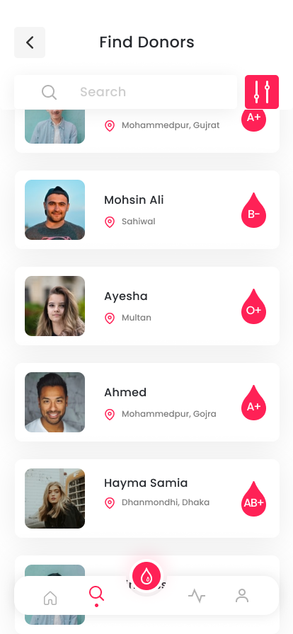Savior is a blood donation app designed to connect recipients with available donors. Users can filter by blood type, view donor details, and quickly find suitable donors through a simple and focused interface.